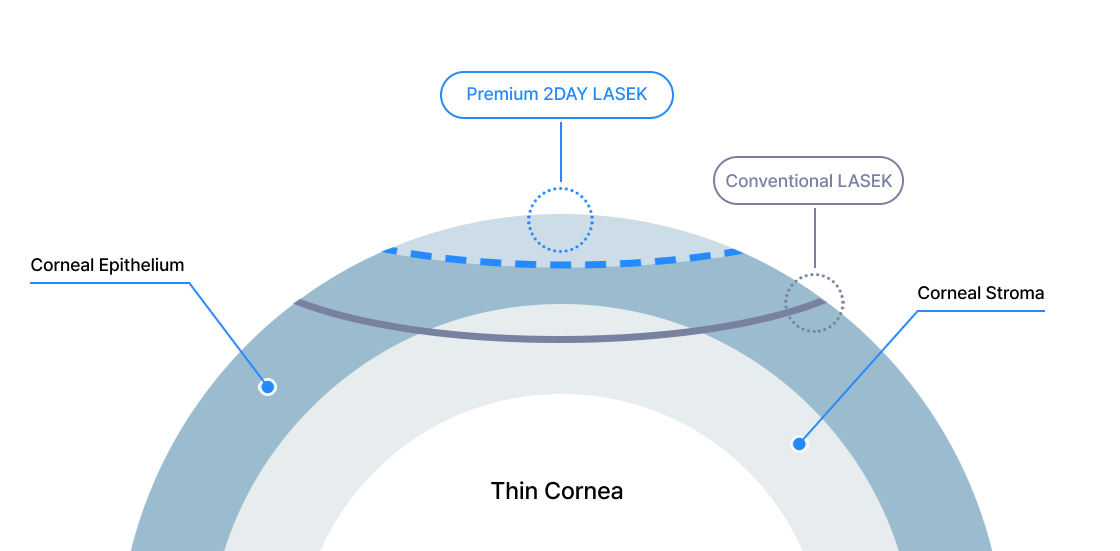 Premium 2DAY LASEK Is Possible Even if the Corneal Thickness Is on the Thinner Side, Meaning if Other Laser Refractive Surgeries Are Not Possible or if the Corneal Surface Is Not Smooth, We Can Still Safely Improve Vision.