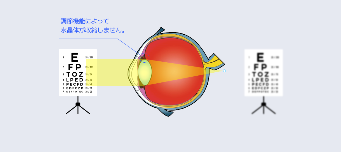 水晶体の弾力性の低下で調節力が低下し、近距離のものがはっきりと見えません。