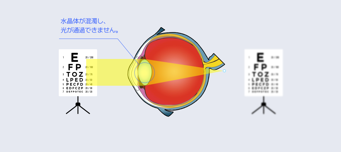 水晶体が濁り、物がぼやけて見えたり、かすんで見えたりする病気です。