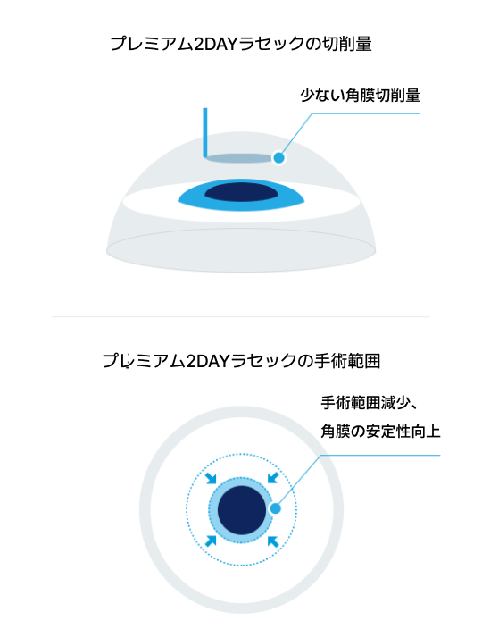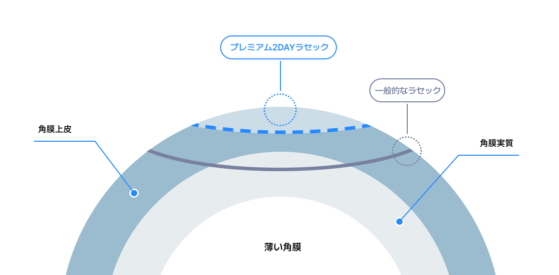 プレミアム2DAYラセックは、角膜の厚みが薄くてレーザーによる視力矯正術が難しい場合や角膜の曲面が曲がって